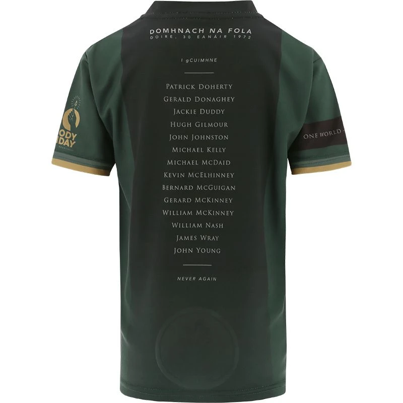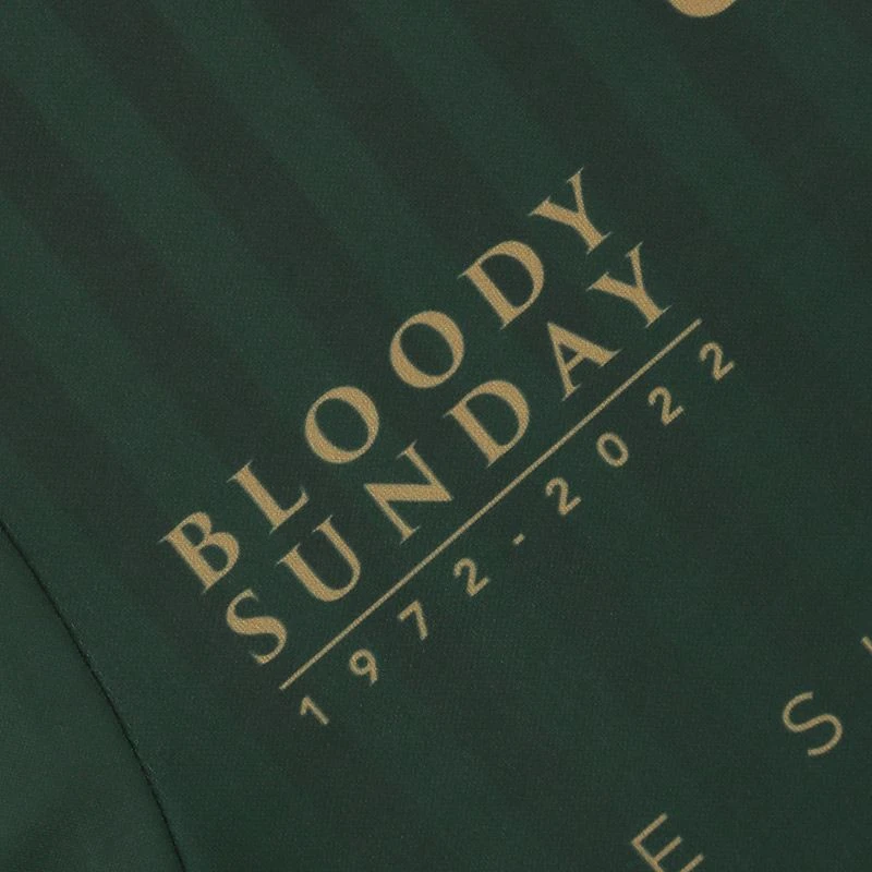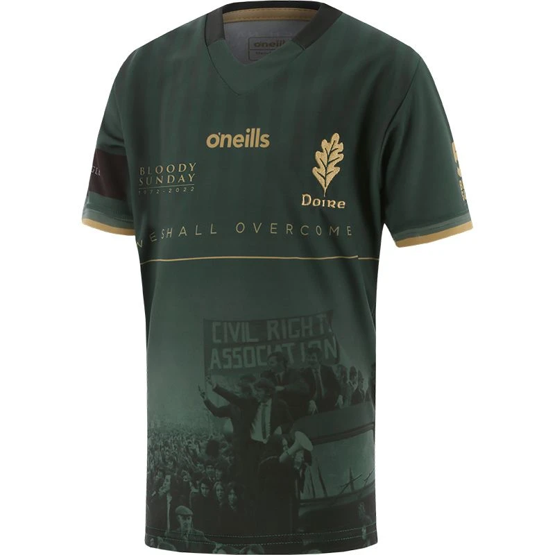 To commemorate the 50th anniversary, the Bloody Sunday Trust requested a special jersey to be created by O’Neills to remember the victims and mark the historical milestone. The Derry Bloody Sunday Commemoration Jersey features the iconic image of the civil rights march on the front with “We Shall Overcome” written in gold across the chest. There are 14 vertical stripes on the chest to commemorate the 14 victims. The names of the victims are listed on the back.