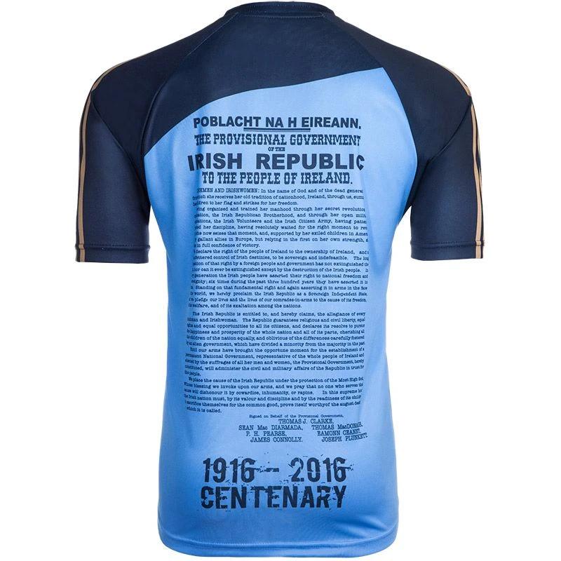 A unique Dublin 1916 Commemoration jersey marks the 100th Anniversary of the Easter Rising 1916 – 2016.  Features a reproduction of the 1916 Proclamation, the ancient Dublin 3 Castles crest and GPO image after the rising, courtesy of the National Library of Ireland.