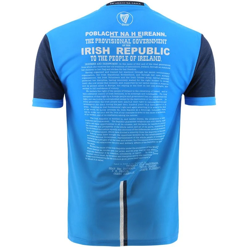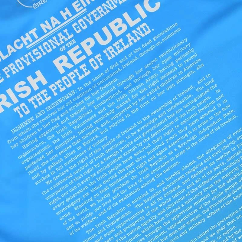 The Dublin 1916 jersey is a unique Irish heritage gift. The jersey is made from high performance Koolite fabric that transports moisture away from the skin. The jersey features a reproduction of the 1916 Proclamation, water marked harp detail, an embroidered harp and “Éirà Amach na Casca” text across the back of the neck.