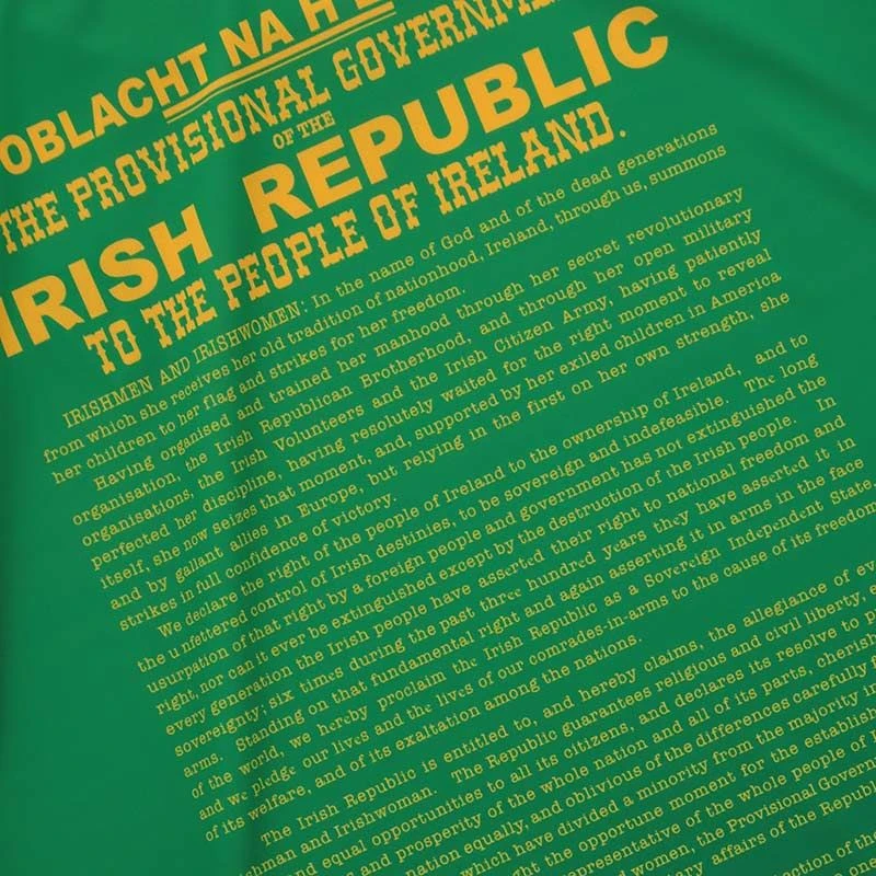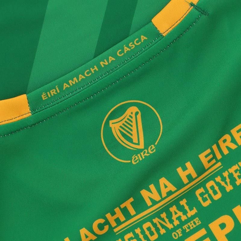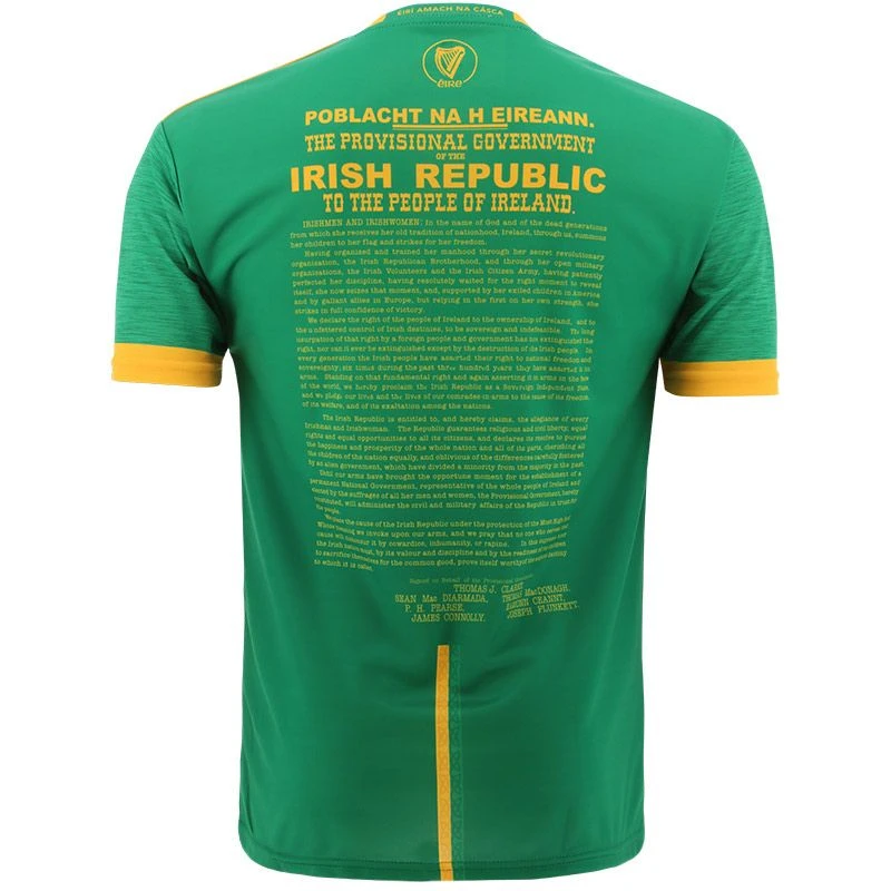 The Kerry 1916 jersey is a unique Irish heritage gift. The jersey is made from high performance Koolite fabric that transports moisture away from the skin. The jersey features a reproduction of the 1916 Proclamation, water marked harp detail, an embroidered harp and “Éirà Amach na Casca” text across the back of the neck.