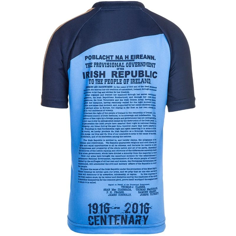 A unique Dublin 1916 Commemoration jersey marks the 100th Anniversary of the Easter Rising 1916 – 2016.  Features a reproduction of the 1916 Proclamation, the ancient Dublin 3 Castles crest and GPO image after the rising, courtesy of the National Library of Ireland.