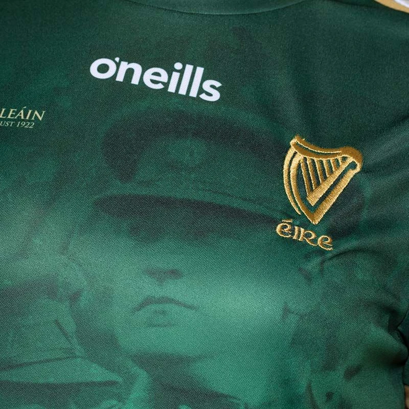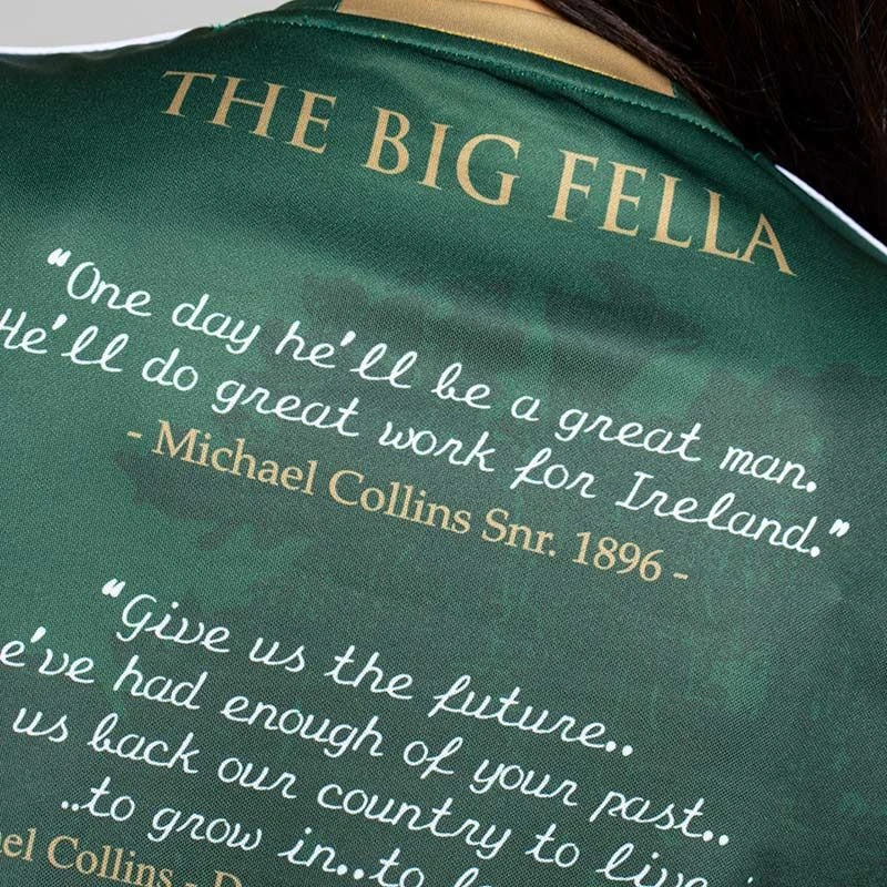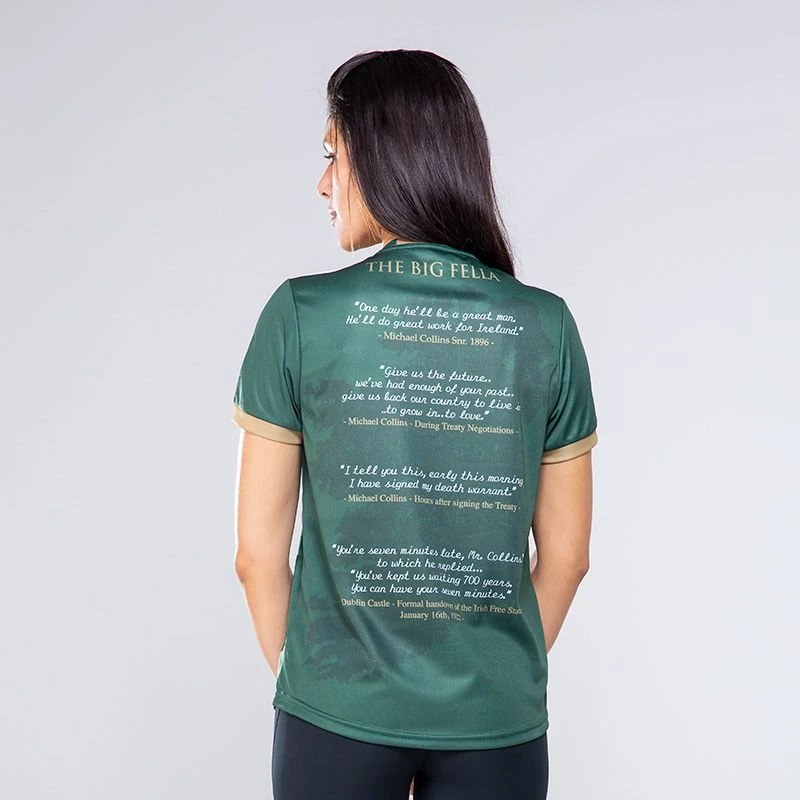 The Michael Collins Women’s Commemoration jersey is now available. The jersey features a portrait of Michael Collins on the front with some of the most famous quotes from “The Big Fella” detailed on the back of the jersey. The new jersey pays tribute to the Irish revolutionary, soldier, and politician. Show your Irish pride with the Michael Collins Commemoration jersey!