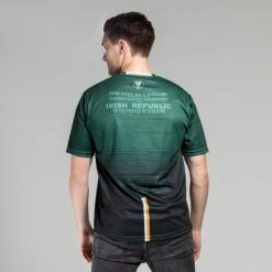 New 1916 commemoration jersey is styled in a brilliant deep green colour with white and gold twin stripe Celtic knot detail across the upper chest, finished with a rich gold embroidered Éire harp crest, Éirà Amach na Cásca text and watermarked harp design. The back of the jersey features the historic Poblacht na hÉireann.