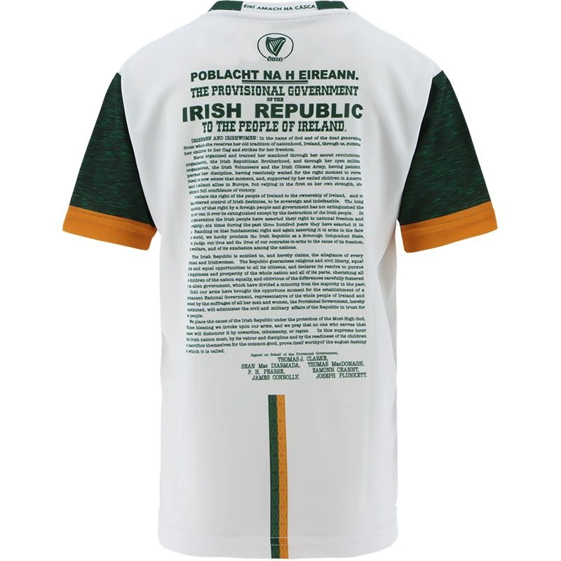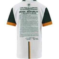New 1916 commemoration jersey is styled in a brilliant white colour with green and gold twin stripe Celtic knot detail across the upper chest, finished with a rich gold embroidered Éire harp crest, Éirà Amach na Cásca text and watermarked harp design. The back of the jersey features the historic Poblacht na hÉireann.