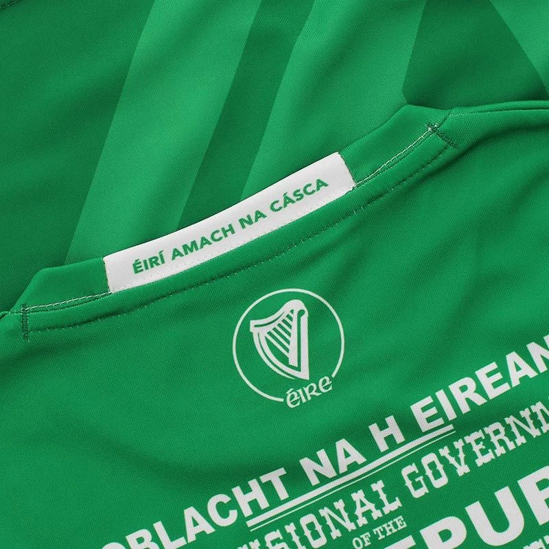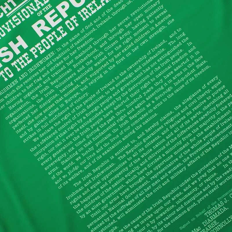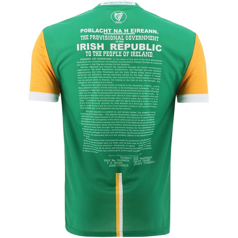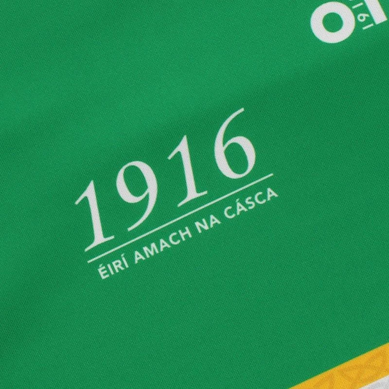 The Offaly 1916 jersey is a unique Irish heritage gift. The jersey is made from high performance Koolite fabric that transports moisture away from the skin. The jersey features a reproduction of the 1916 Proclamation, water marked harp detail, an embroidered harp and “Éirà Amach na Casca” text across the back of the neck.