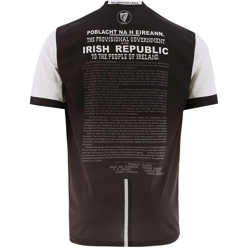 The Sligo 1916 jersey is a unique Irish heritage gift. The jersey is made from high performance Koolite fabric that transports moisture away from the skin. The jersey features a reproduction of the 1916 Proclamation, water marked harp detail, an embroidered harp and “Éirà Amach na Casca” text across the back of the neck.